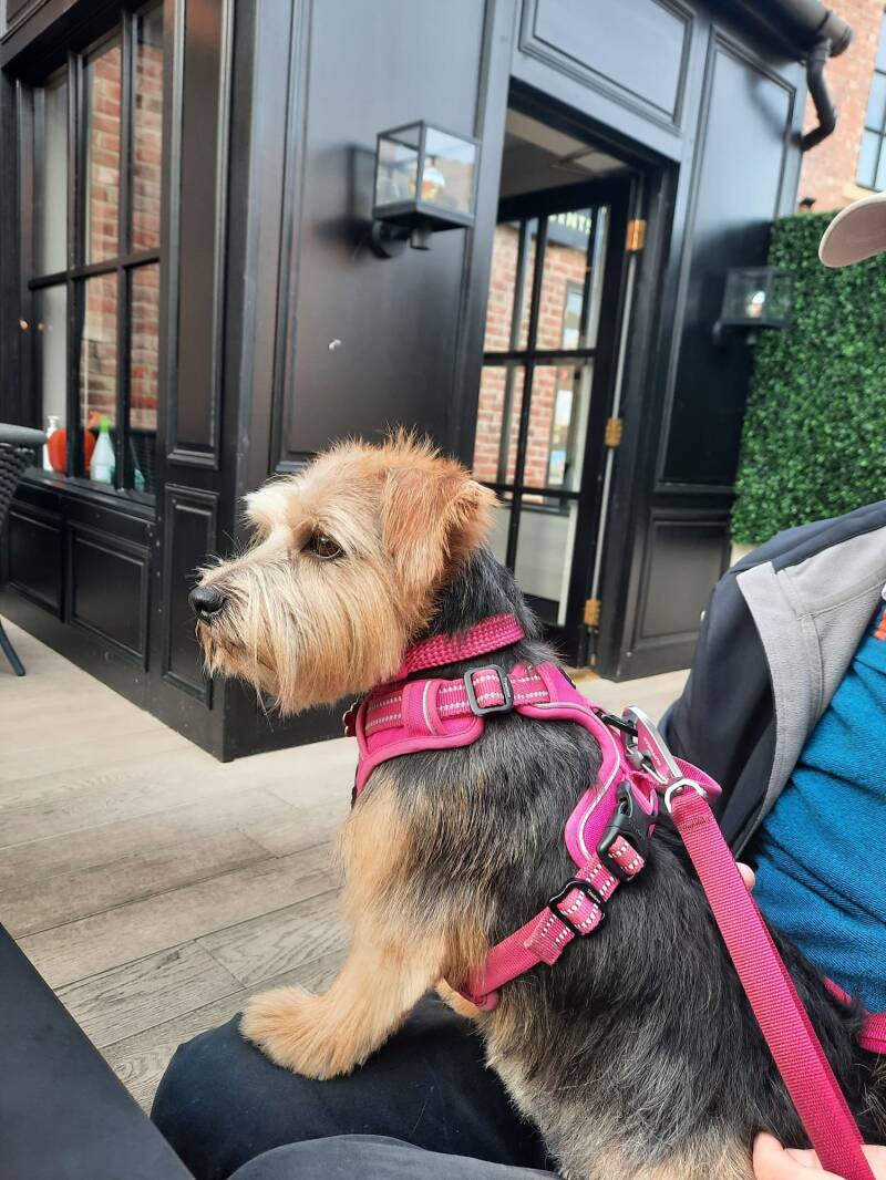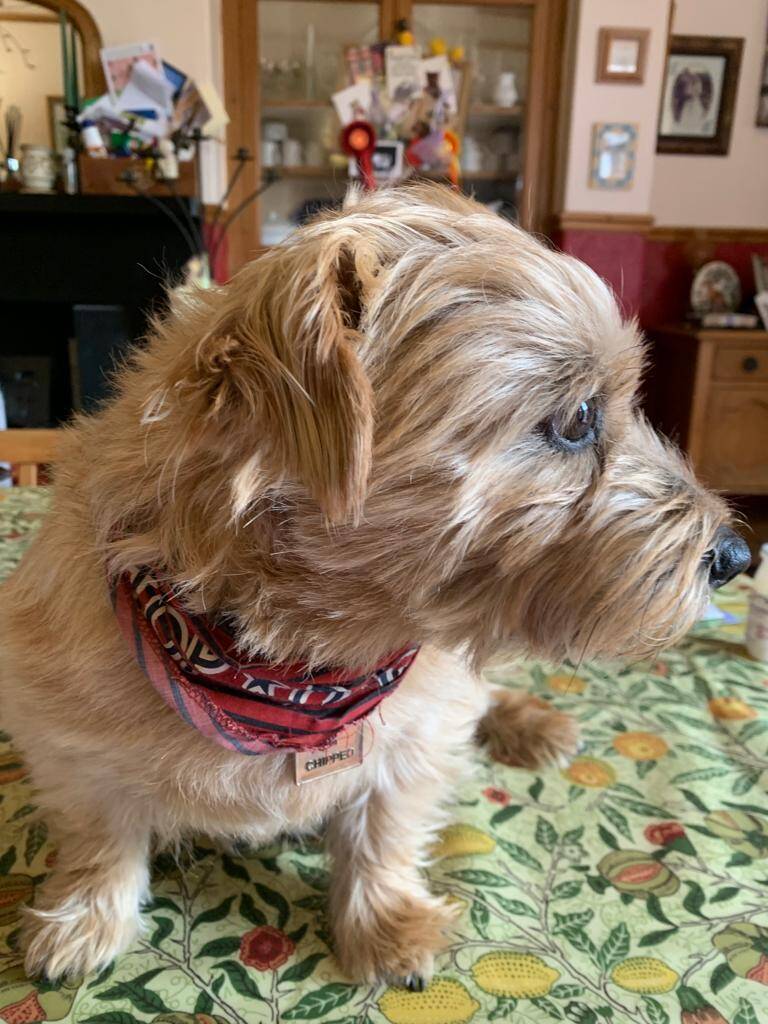 Bertie has had so many admirers out and about in Norfolk on holiday and he has recently been beautifully stripped. I’ll send you pics of him digging and waiting for his bedtime gravy bone. This is one of my favourite pics of him . He loves the cats outside house. Take care. Vikki.
